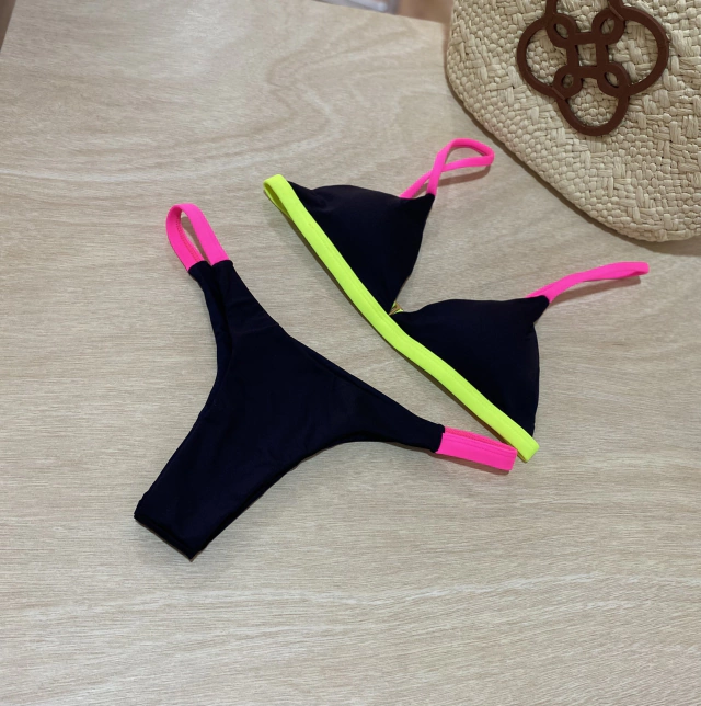 O top com bojo removível e alças ajustáveis para amarração frente única ele se adapta perfeitamente ao seu corpo, garantindo a sustentação necessária sem abrir mão da marquinha perfeita . A calcinha de tira com laterais em neon não só é linda, mas também proporciona máxima segurança e conforto e a marquinha perfeita.