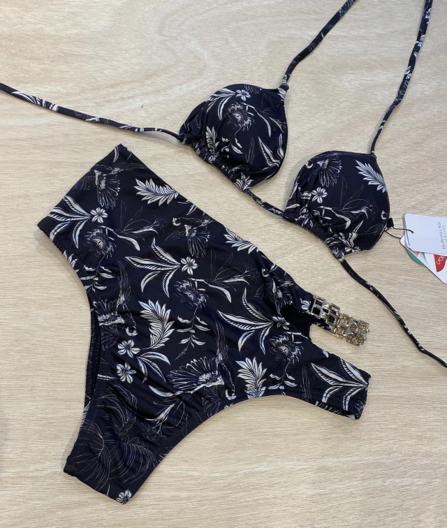 Com detalhes em metal que refletem a luz de maneira encantadora, estas Hot Pants oferecem uma abertura lateral que não apenas valoriza a silhueta, mas também proporciona um toque de ousadia ao visual. O top cortininha com bojo assegura um ajuste confortável e suporte, permitindo liberdade de movimento e confiança a cada passo.