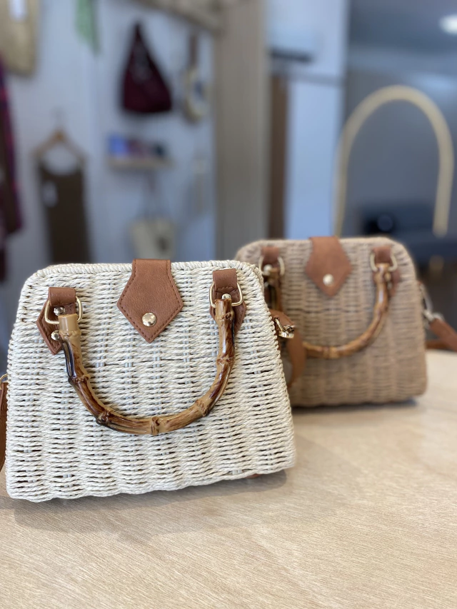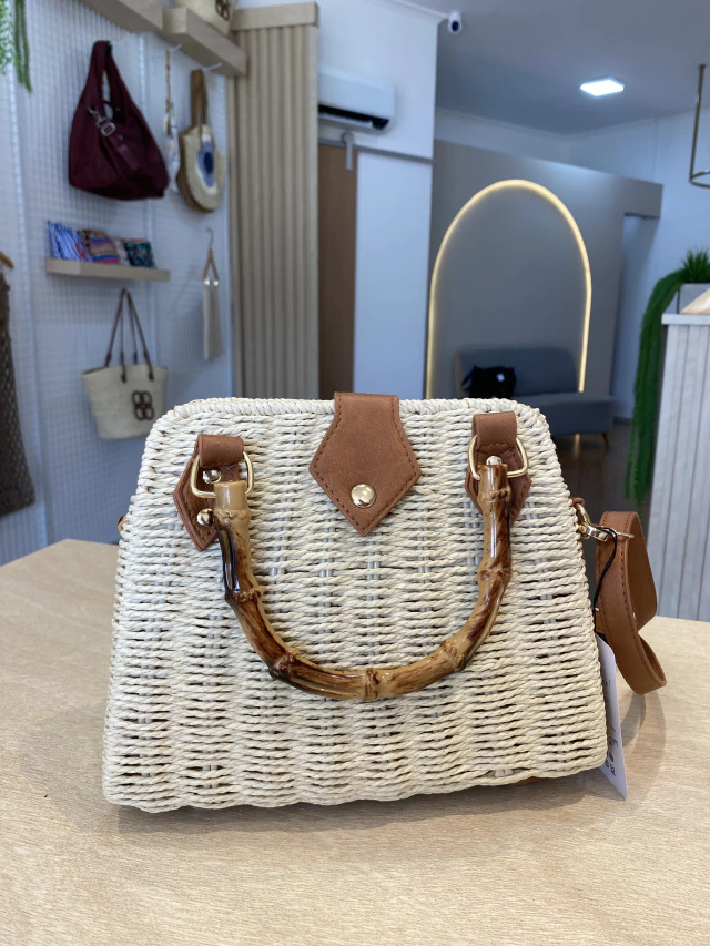 Apresentamos a Bolsa Mia, uma peça que une sofisticação e elegância em um design encantador. Esta bolsa em palha possui alças que imitam bambu, trazendo uma pegada natural e chic ao seu visual.