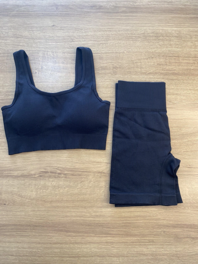 Conjunto de shorts e top reto de design confortável e justo que realça as curvas femininas. Possui tecido respirável de altíssima qualidade. Tecido canelado.