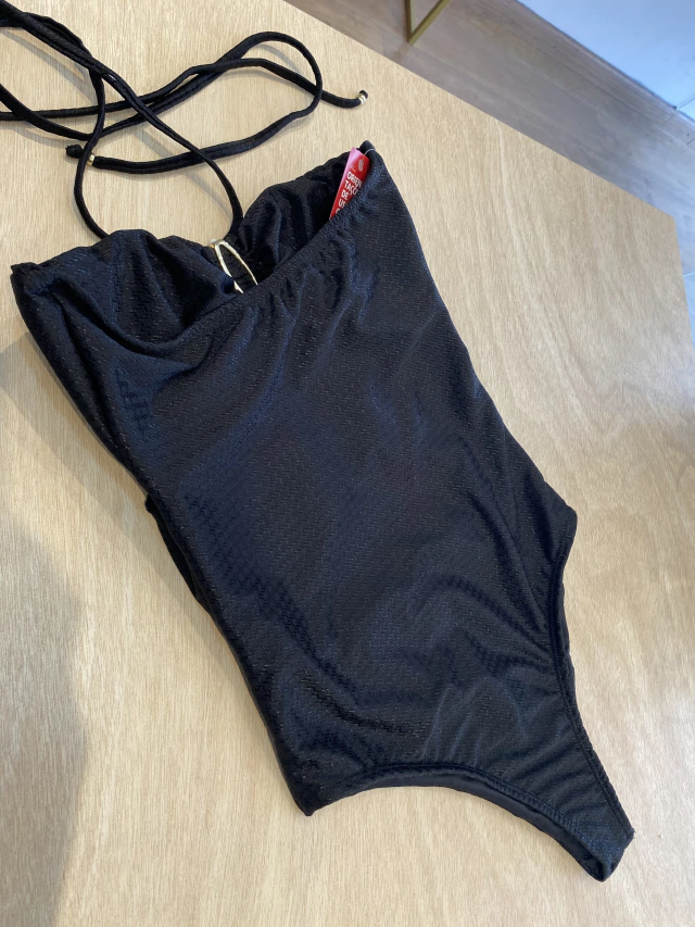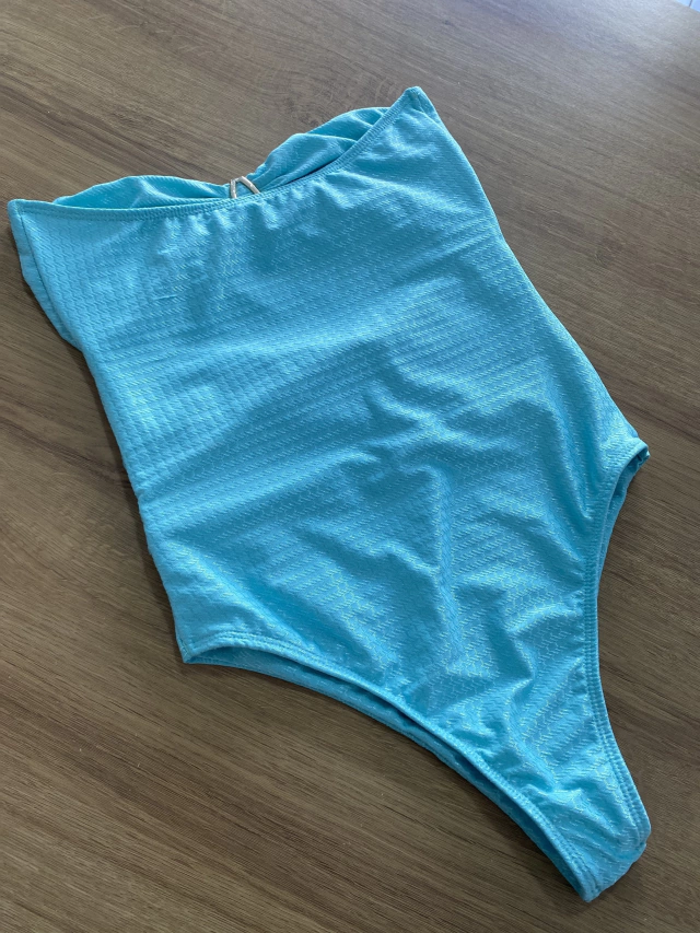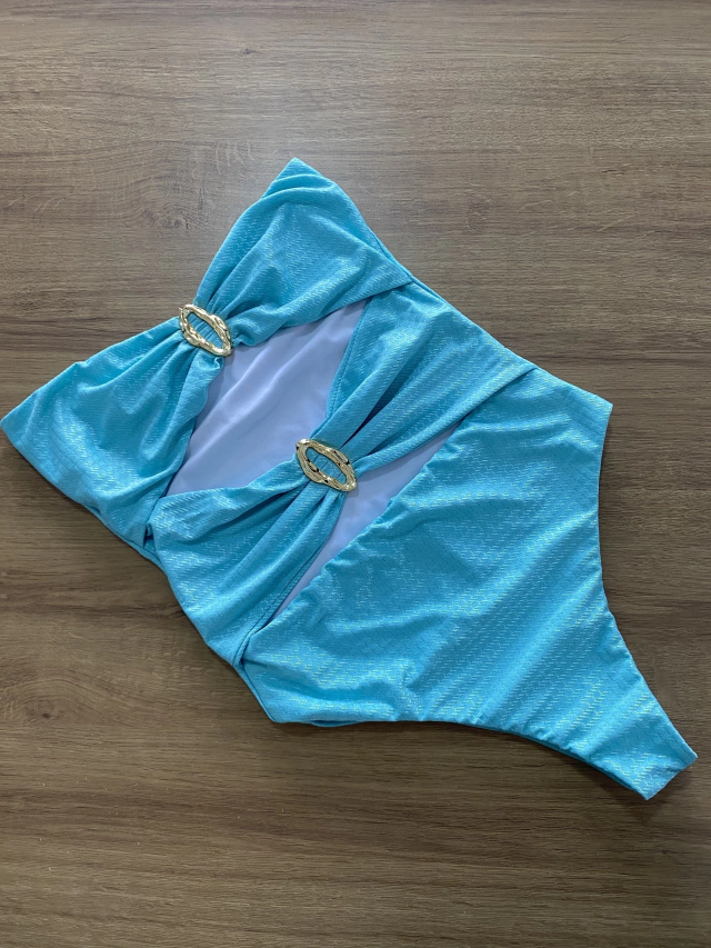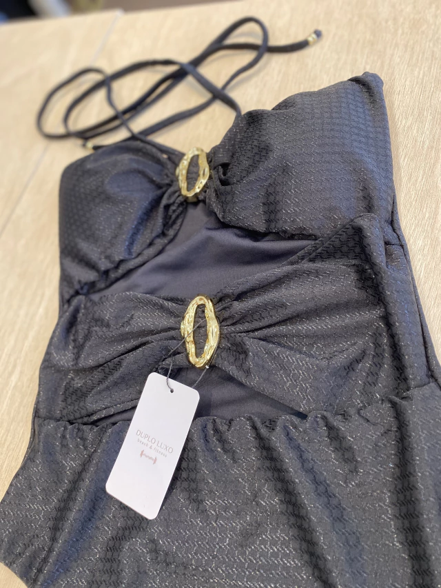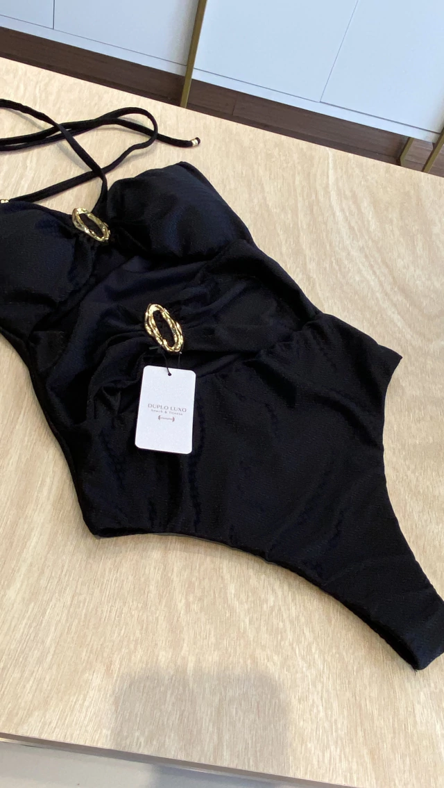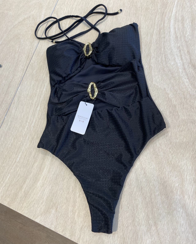 Um maiô que pode ser usado também como BODY, com argola dourada em formato orgânico , bojo removível e tecido com uma leve textura estampada.
